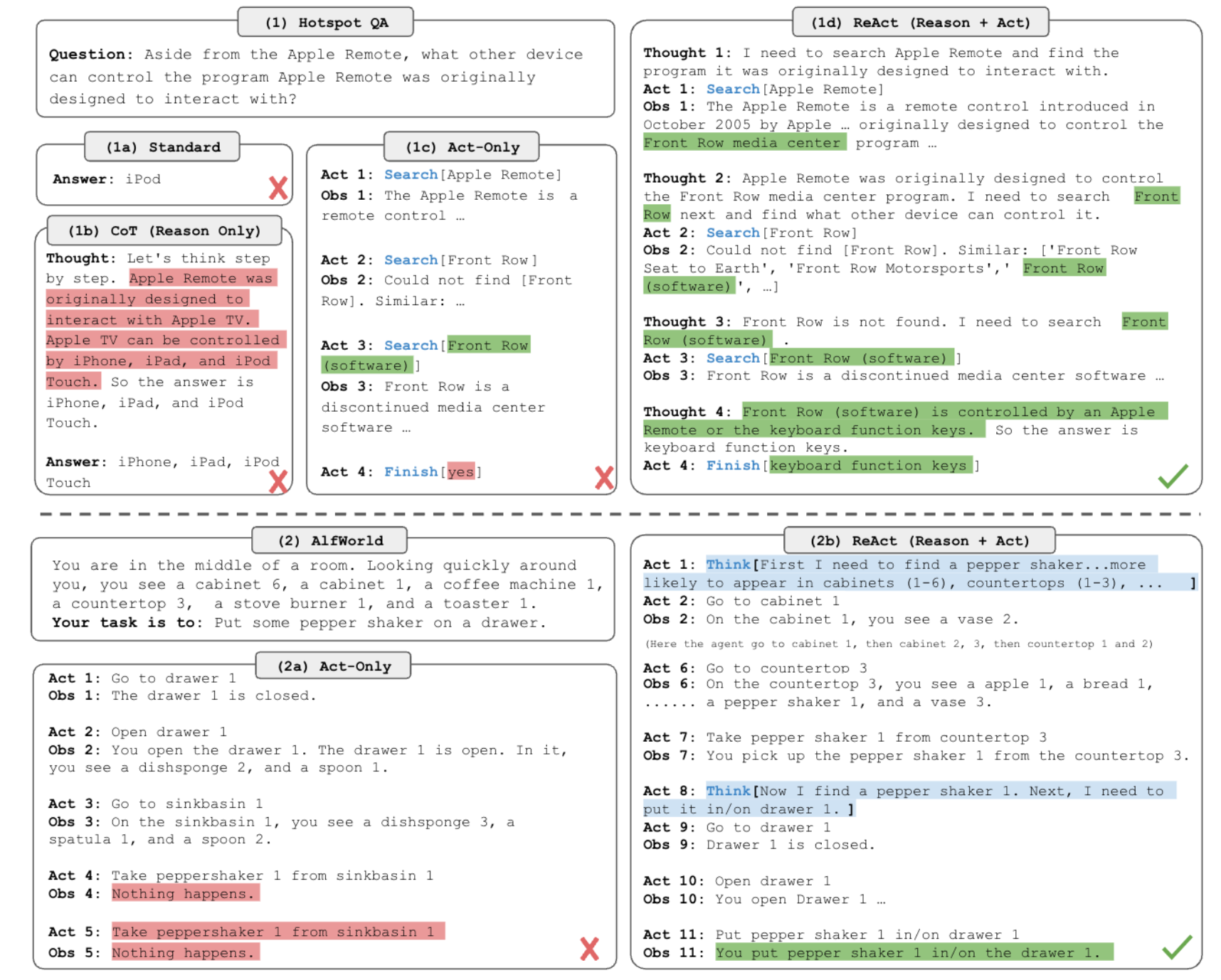 - ReAct 实现方式: 基于冻结的大语言模型实现,无需大量微调,核心依赖 few-shot prompt
