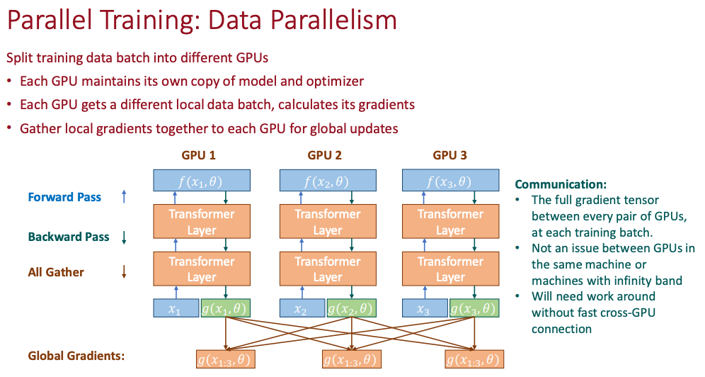 - 梯度汇总: 每个 GPU 计算出来本地的梯度之后,需要和其他的 GPU 通信并且汇总梯度,最简单的汇总就是平均或者求和