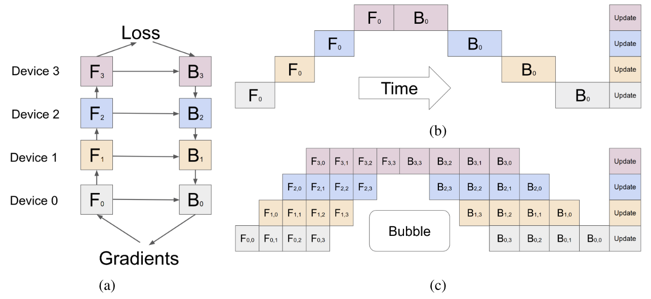 - 为了解决这个 Bubble 浪费的问题,我们可以把一个 mini-batch 划分成 M 个 micro-batch,然后再依次通过多个 GPU 训练,当我们划分 M 个 mini-batch 的时候,气泡占比时间 $\frac{K-1}/{K+M-1}$,实验表明,当 $M\ge 4K$ 的时候,气泡产生的空转时间对训练时长影响非常轻微