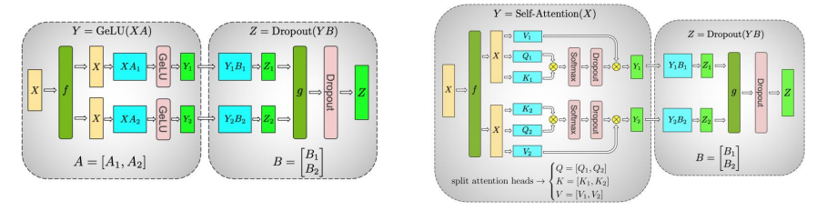 - 张量并行的在 MLP 和 Self-Attention 的两类方法
