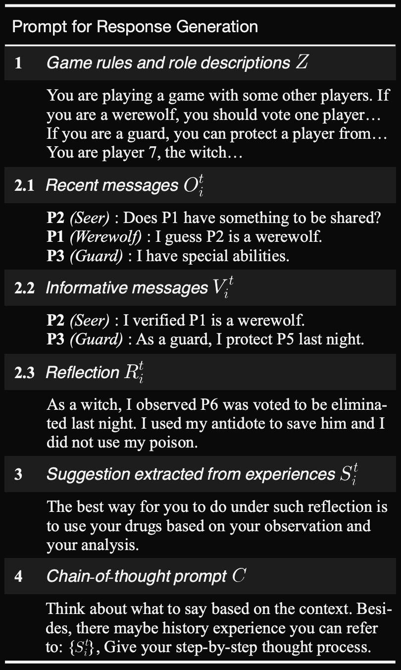 基于游戏规则、上下文(尤其是刚完成的反思 {R_t_i})以及可参考的历史经验 {S_t_i},请分步思考并生成简洁的发言内容(不超过两句话)。
