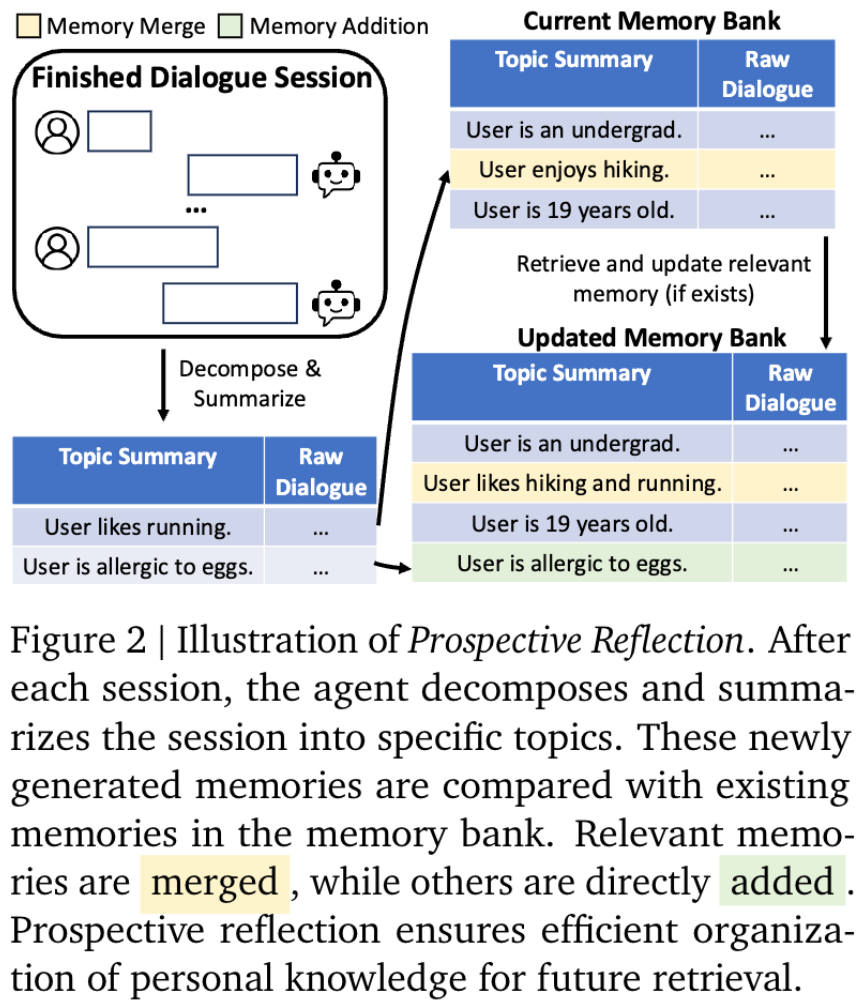 Prospective Reflection 前瞻性反思实现了基于话题的记忆组织结构,主要分为两个关键流程 memory extraction (记忆抽取) 和 memory update (记忆总结)