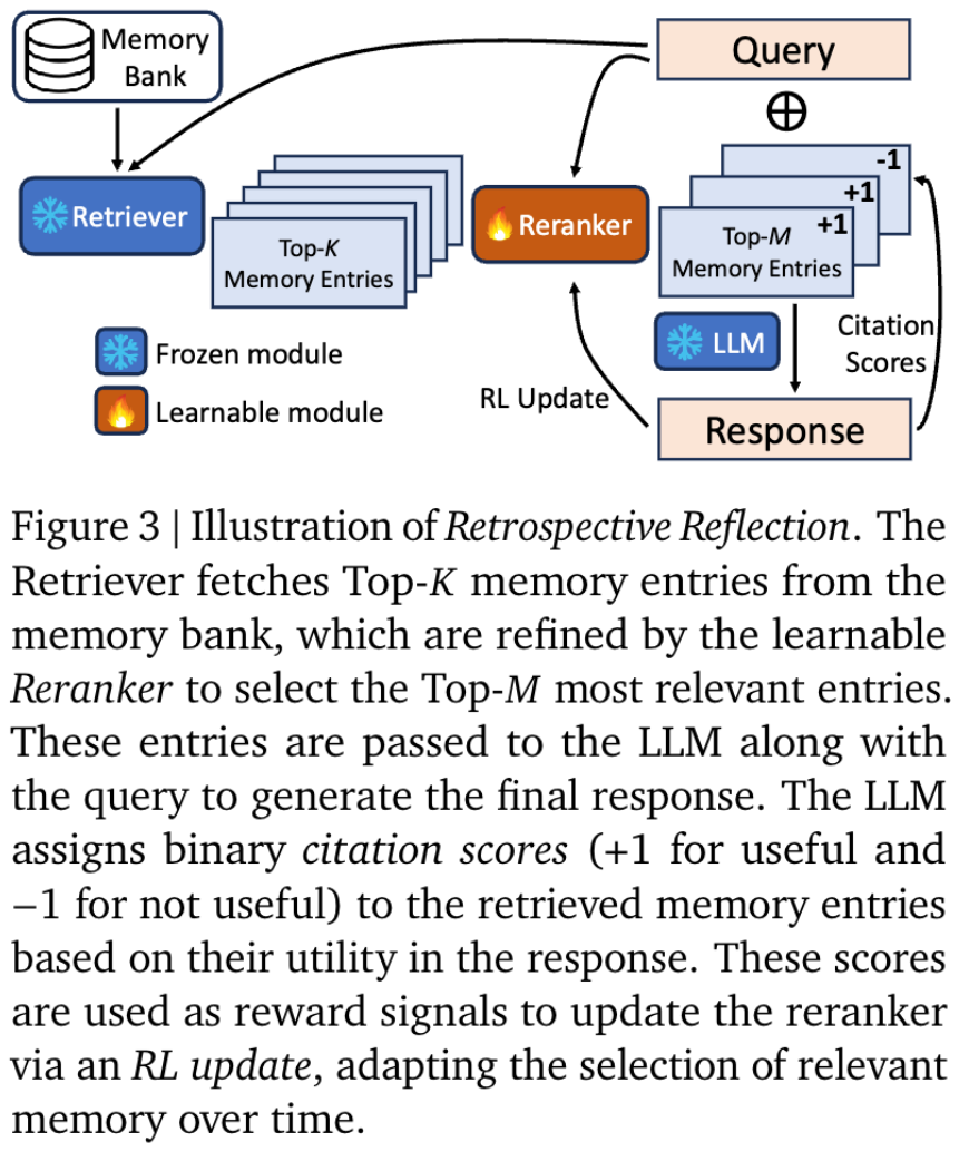 Retrospective Reflection 的核心思想就是要实现一个高效的 reranker, reranker 能对检索回来的多个记忆进行排序,找到那些能够最有效结合后能实现更高质量回复的记忆, 也就是 <更高的记忆排序分 == 结合记忆得到更优质回复>