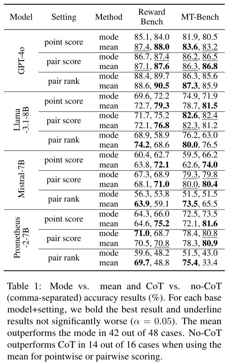 Mean outperforms mode The mean outperforms the mode in 42 out of 48 cases. In Table 10, we provide a subset breakdown of RewardBench and observe particularly large gains for pointwise scoring on the Reasoning subset.