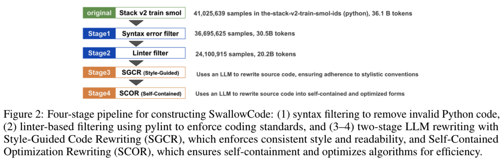 1.对 Code 预训练数据进行改写,得到 SwallowCode 实现风格一致且代码语义重写的高质量预训练数据