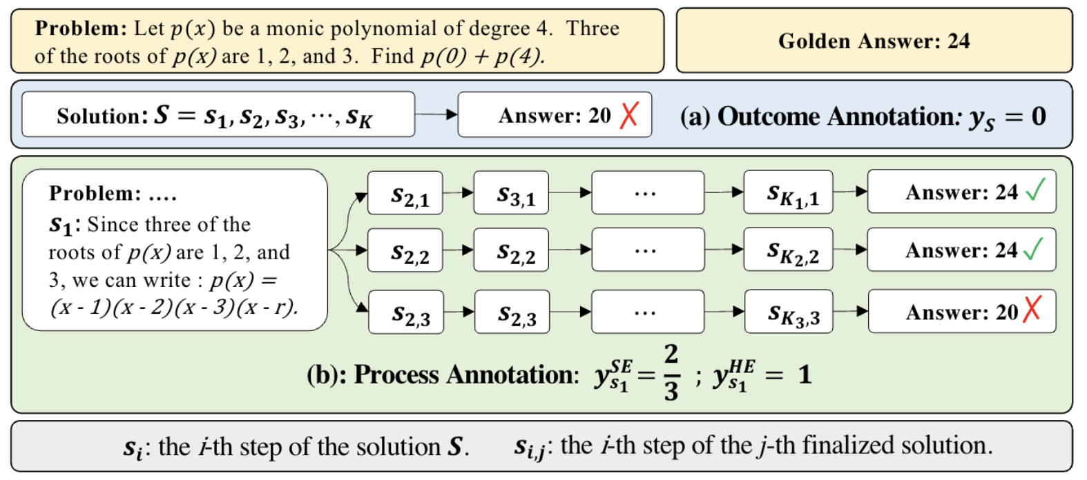 2.Estimation 量化步骤 $si$ 的价值 $y{s_i}$, $s_i$ 基于从它开始生成的所有可能完成的序列, $s_i$ 通向未来的结局有多种, 可能有的正确, 可能的错误, 我们关心的是一个 “潜力评分” 或者 “未来的可行性”, 计算上有两类方法 hard_estimation 和 soft_estimation:
